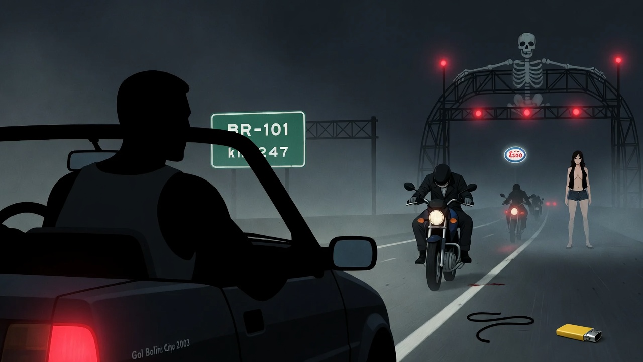Jota olhou pelo retrovisor uma última vez. Lá longe, luzes vermelhas das caveiras piscavam na névoa como promessa de reencontro.