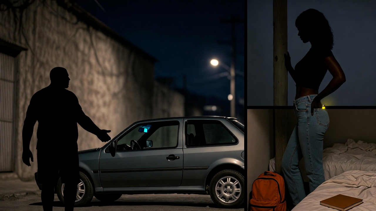 O quarto é pequeno, escuro, só luz de abajur vermelho no criado-mudo.