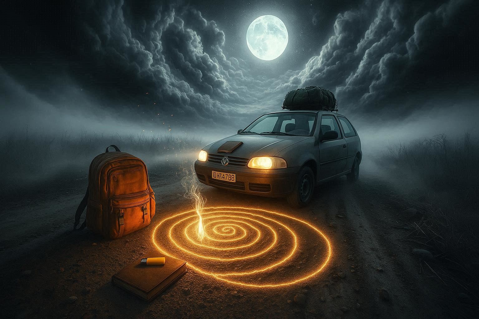 O lugar não parece mais o mesmo. A deformação no chão não existe mais. Ao me virar para o carro, encontro o caderno e a mochila laranja na porta.