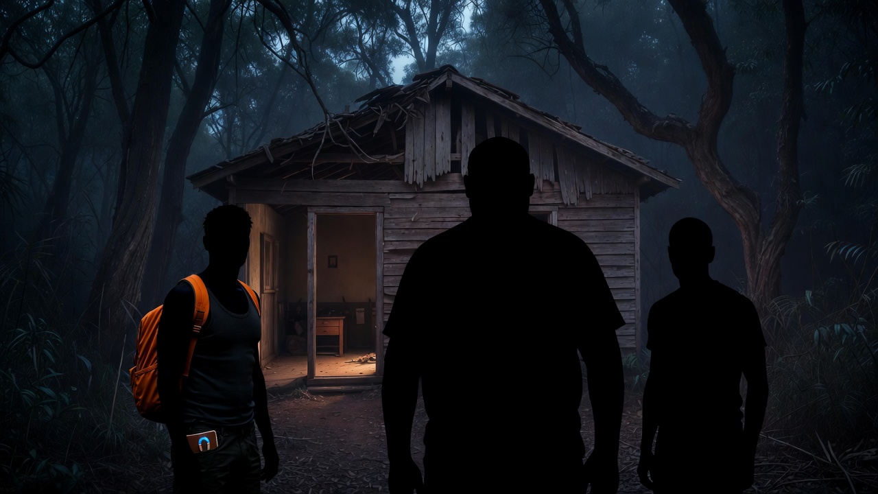 Velha. Descascada. Paredes de madeira com tinta morta revelando camadas de cores antigas, cada uma memória de morador que já não existia. O telhado estava parcialmente desabado, telhas quebradas espalhadas pelo chão ao redor. Janelas trancadas com tábuas pregadas de forma torta, porta da frente entreaberta rangendo sozinha com o vento que não existia. A casa parecia ter sido construída pra ser esquecida, escondida no meio do bosque, esperando por quem soubesse procurar.