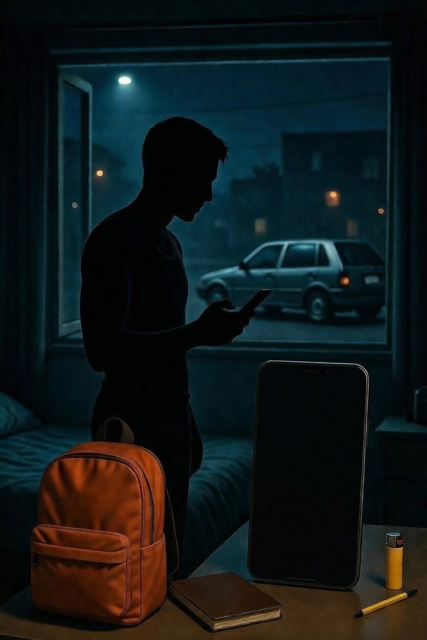Jota deita de costas, celular no peito, olhos abertos no escuro. A mochila laranja continua no canto. O caderno marrom continua fechado. O isqueiro amarelo continua na mesa. Lá fora, o Gol Bolinha continua estacionado. Tudo parado. Tudo esperando.