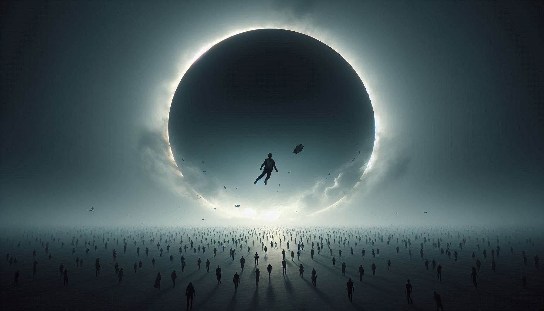 O céu não tem cor. Cinza sólido, uniforme, sem nuvens, sem sol, sem nada que indique vida lá em cima. Só o rasgo. Enorme. Perfeitamente circular. Negro. Suspenso no horizonte como uma ferida aberta no tecido do mundo. O buraco não reflete luz. Não emite som. Apenas existe. E suga tudo na direção dele.