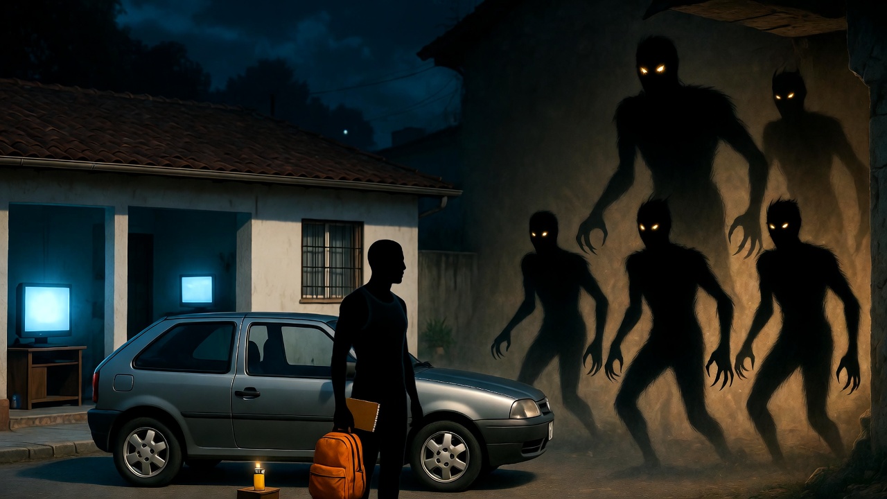 Jota freia o Gol Bolinha na frente de casa, duas portas rangendo. Nove e quinze da noite. Atrasado. De novo. O trânsito da BR-277 tinha virado pesadelo, caminhão tombado, desvio, caos.