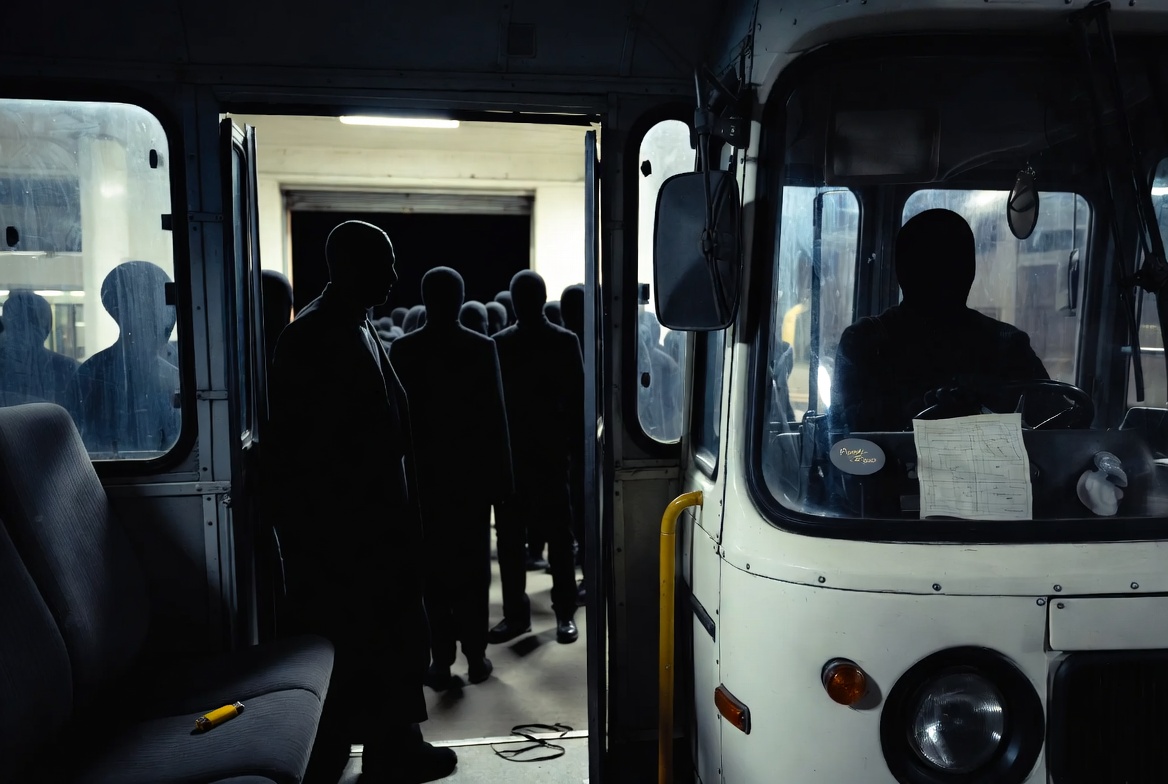 Jota é o primeiro a subir os três degraus de ferro. O cheiro dentro é de banco de couro queimado de sol, mofo e diesel velho. O painel está aceso só pela luzinha vermelha do freio de mão. O motorista usa boné escuro, aba baixa, rosto na sombra. Não vira pra ninguém. Só mantém as mãos no volante, esperando.